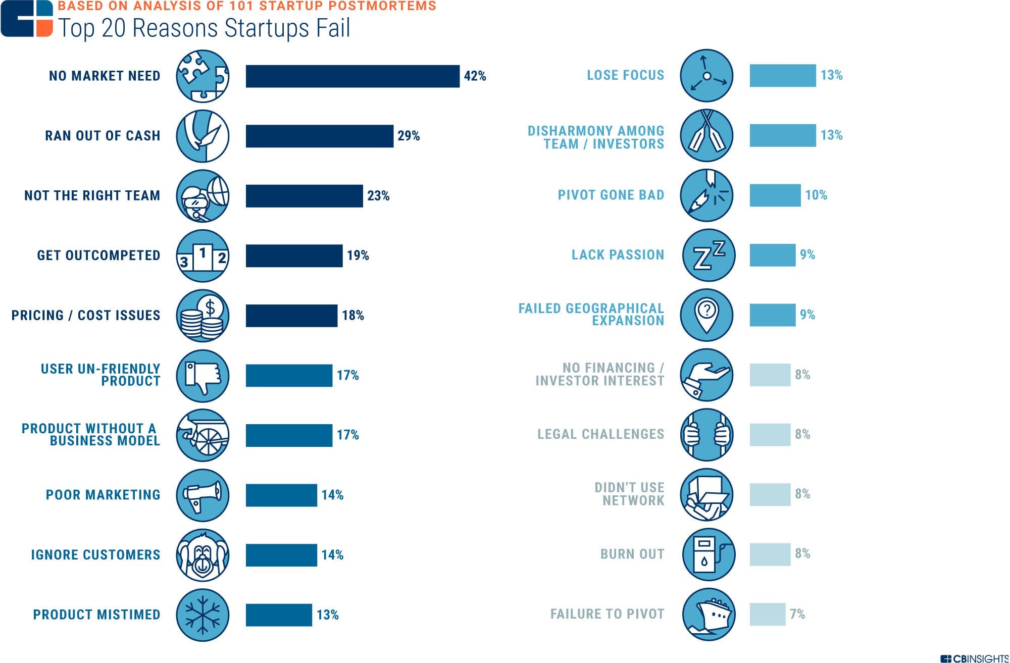 사진을 보면, 스타트업이 망하는 20가지 이유중에서 단연 최고는 '시장이 필요없는 것을 만들어서'다.